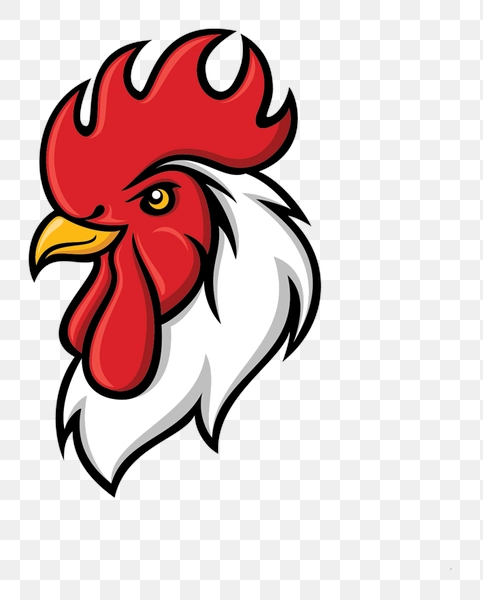 This image depicts a cartoon-style illustration of a rooster. The rooster is rendered in a bold black and white design, featuring a predominantly white head and neck, and a vibrant orange comb and wattle. The rooster's expression is focused and intense, with a sharp beak and detailed eye. The design employs sharp lines and strong contrasts to create a graphic and dynamic visual effect.