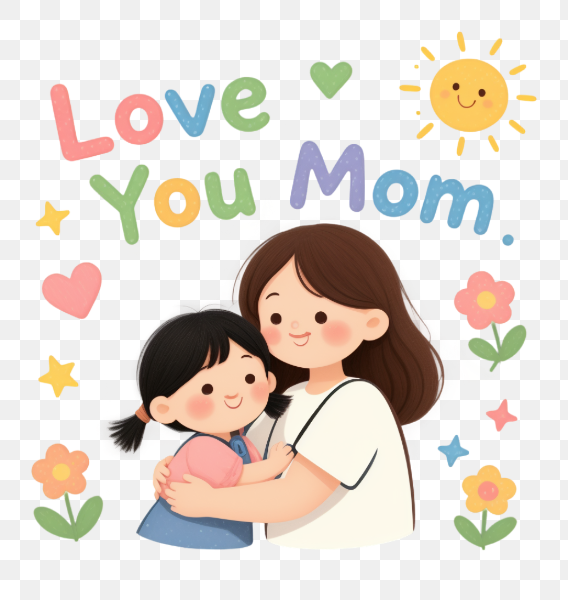 The image is a digitally created png illustration with a transparent background, centered around the theme of "Love You Mom". The focal point is a heartwarming depiction of a mother and daughter embracing.